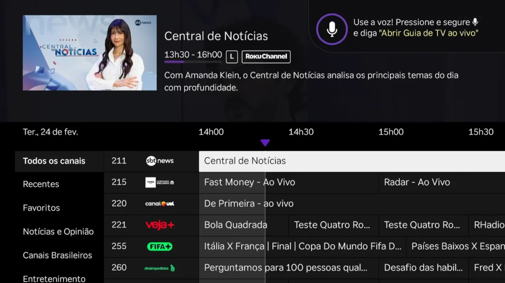 O primeiro recurso não é exatamente um aplicativo externo, mas sim uma funcionalidade nativa do sistema Roku: o Guia de TV ao Vivo (Roku Channels).